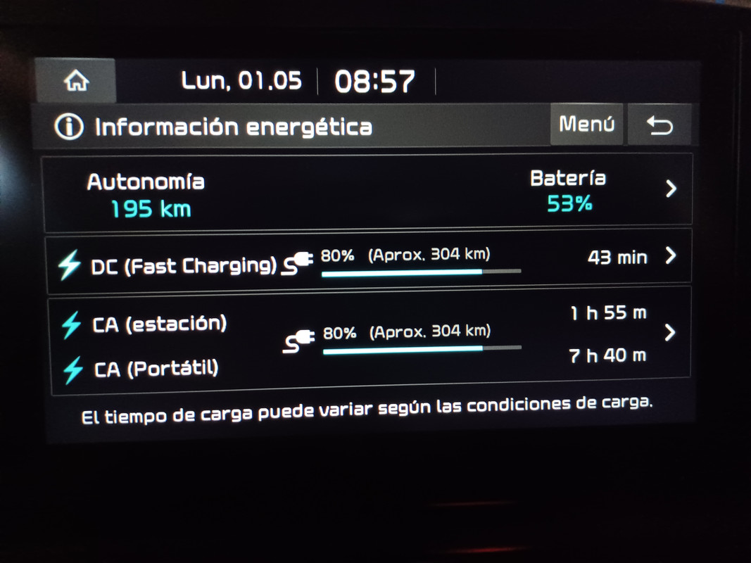 Ayer decidí no cargar la batería (darle 2 días de uso sin cargar) y usar el coche hoy. Cuando llegué a casa estaba a un 54% y me marcaba 201km de autonomía. Pero hoy al coger el coche a la mañana la sorpresa es que marcaba un 52% y 190km.